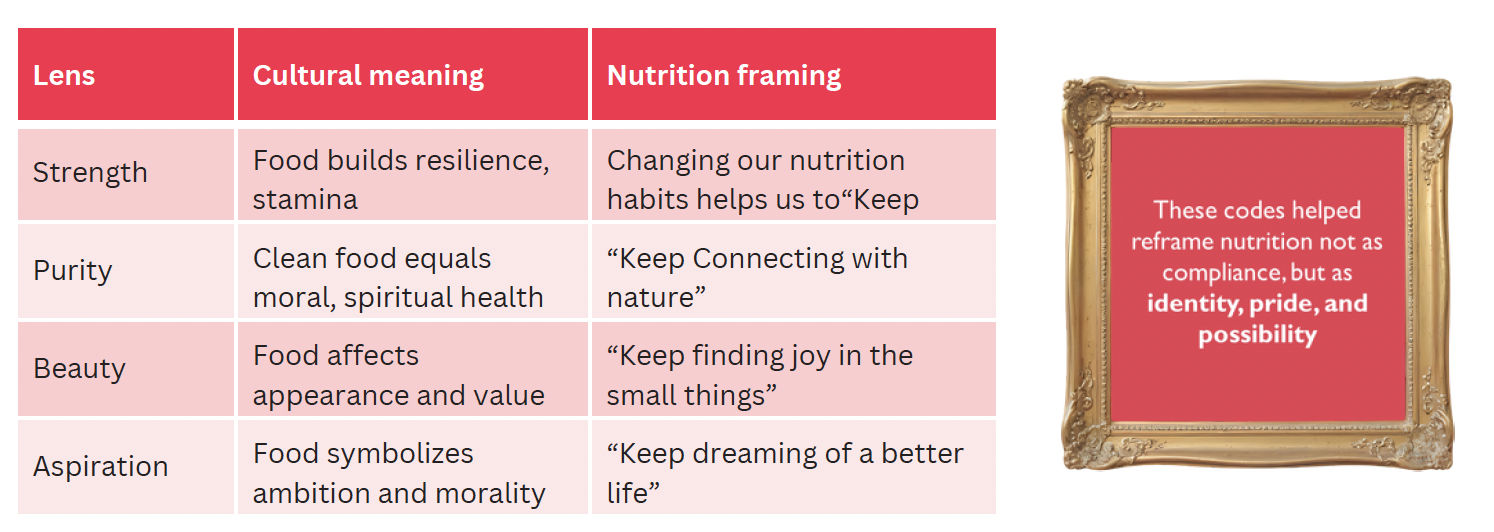The semiotic analysis revealed that in Bangladesh, food is experienced not just as nourishment but as a site of moral value, spiritual practice, aesthetic expression, and social identity. Colour emerged as a key semiotic cue: vibrant tones in food, packaging, and markets signal abundance, trust, and pleasure. This contrasts with NGO nutrition messaging which often relies on neutral, medicalised designs that feel distant. Crucially, the research showed that SBC that ignores these cultural logics risks lack of engagement and superficial uptake. Working with these narratives builds emotional resonance, trust, and sustained behaviour change.