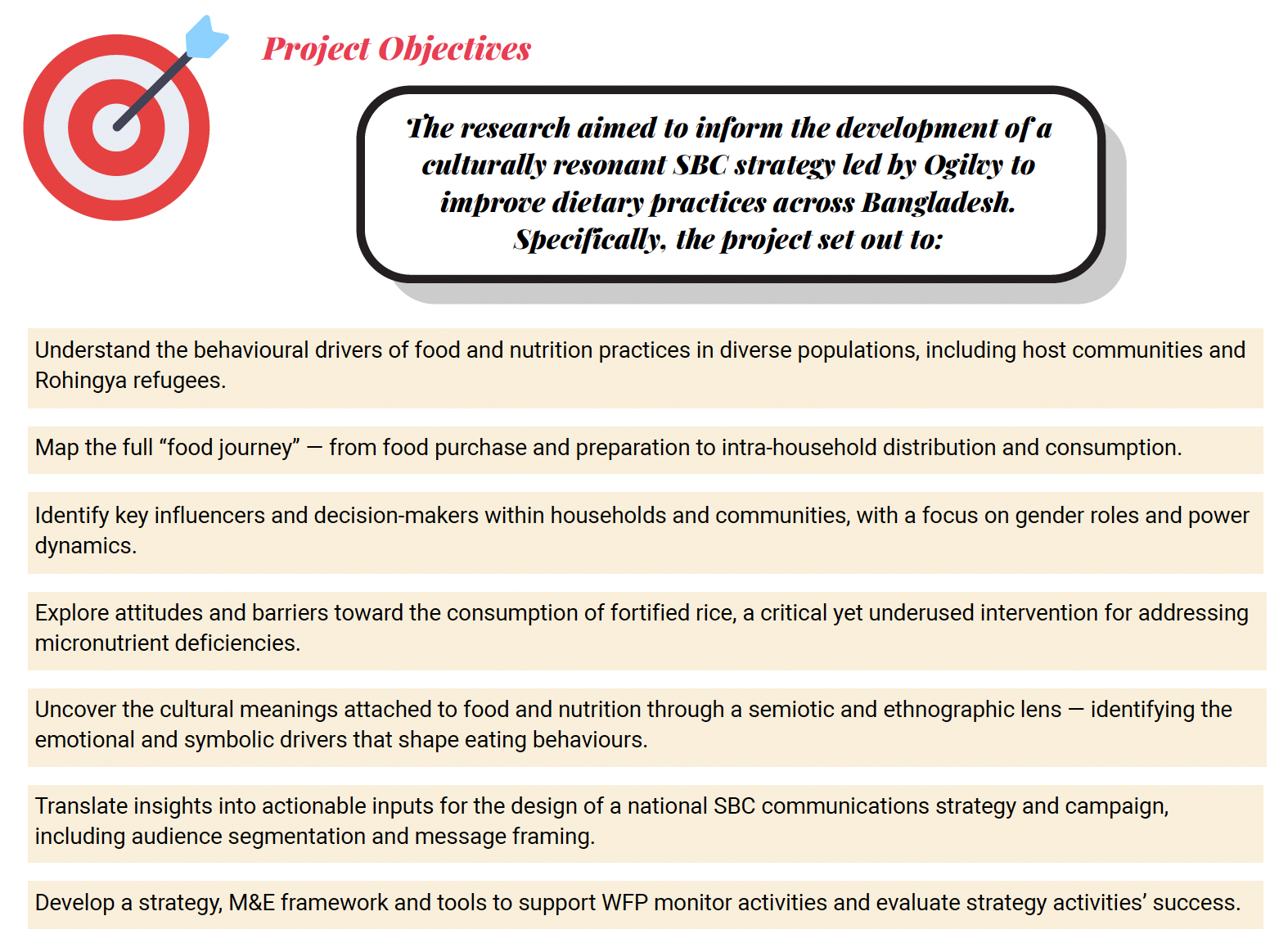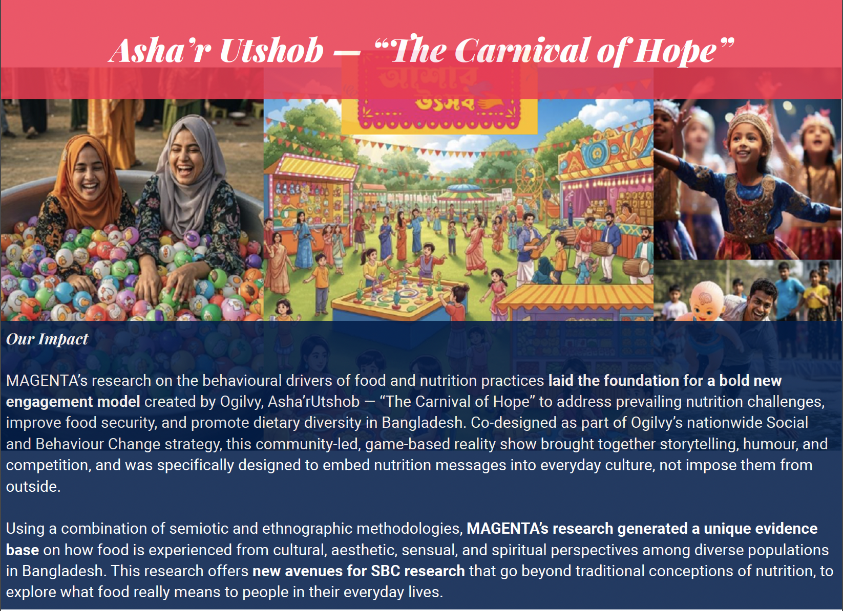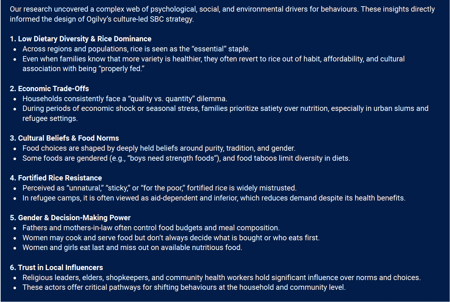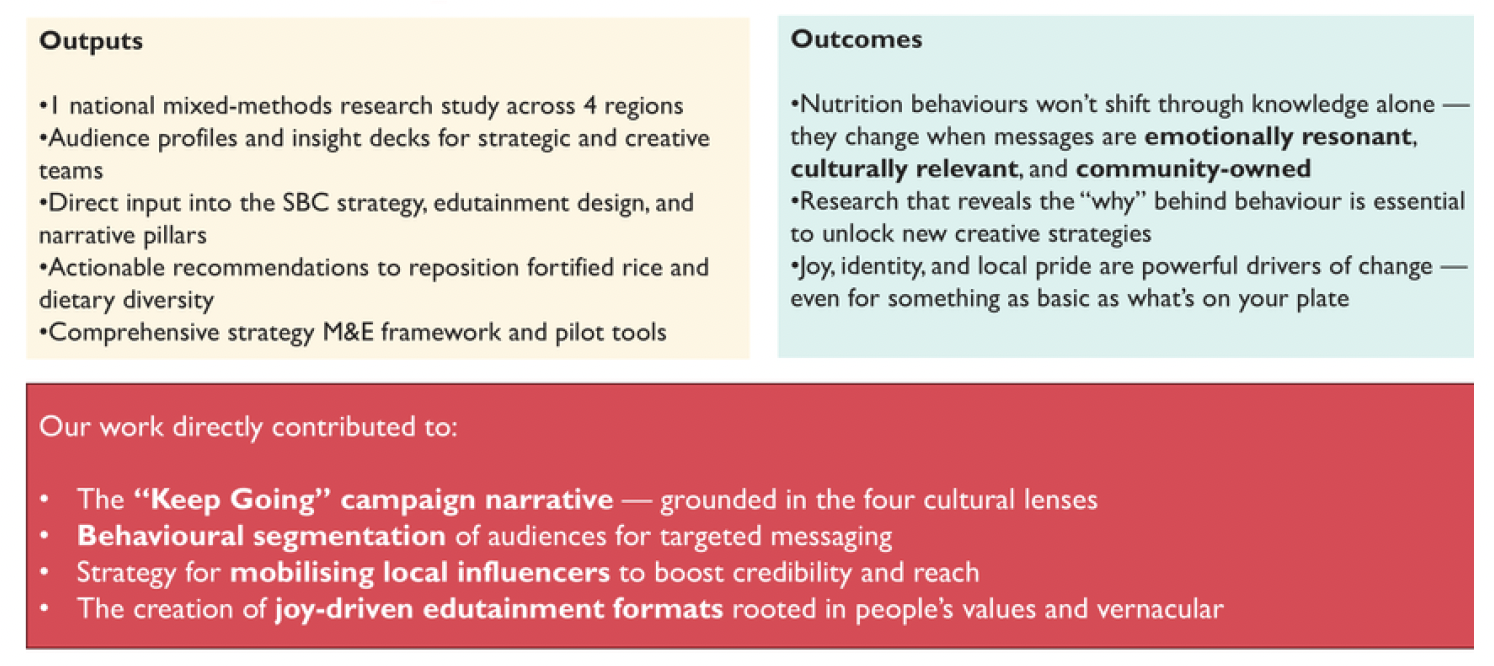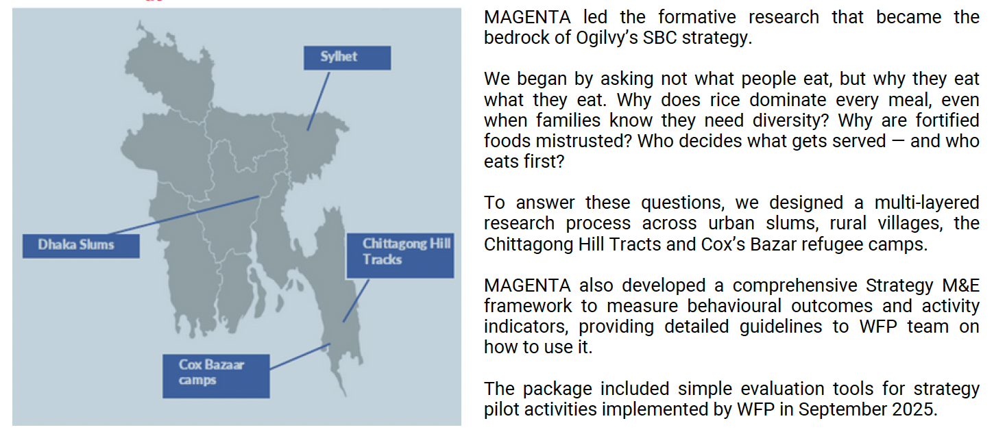 Because food behaviours are deeply emotional, culturally coded, and socially reinforced, traditional awareness campaigns — focused on nutrition facts — fail to speak to the identity, power dynamics, and aspiration that truly drive food choices. WFP, in partnership with Ogilvy, needed a nationwide SBC strategy to address these hidden drivers and help communities — including Rohingya refugees — improve their nutrition practices in sustainable, dignified ways.